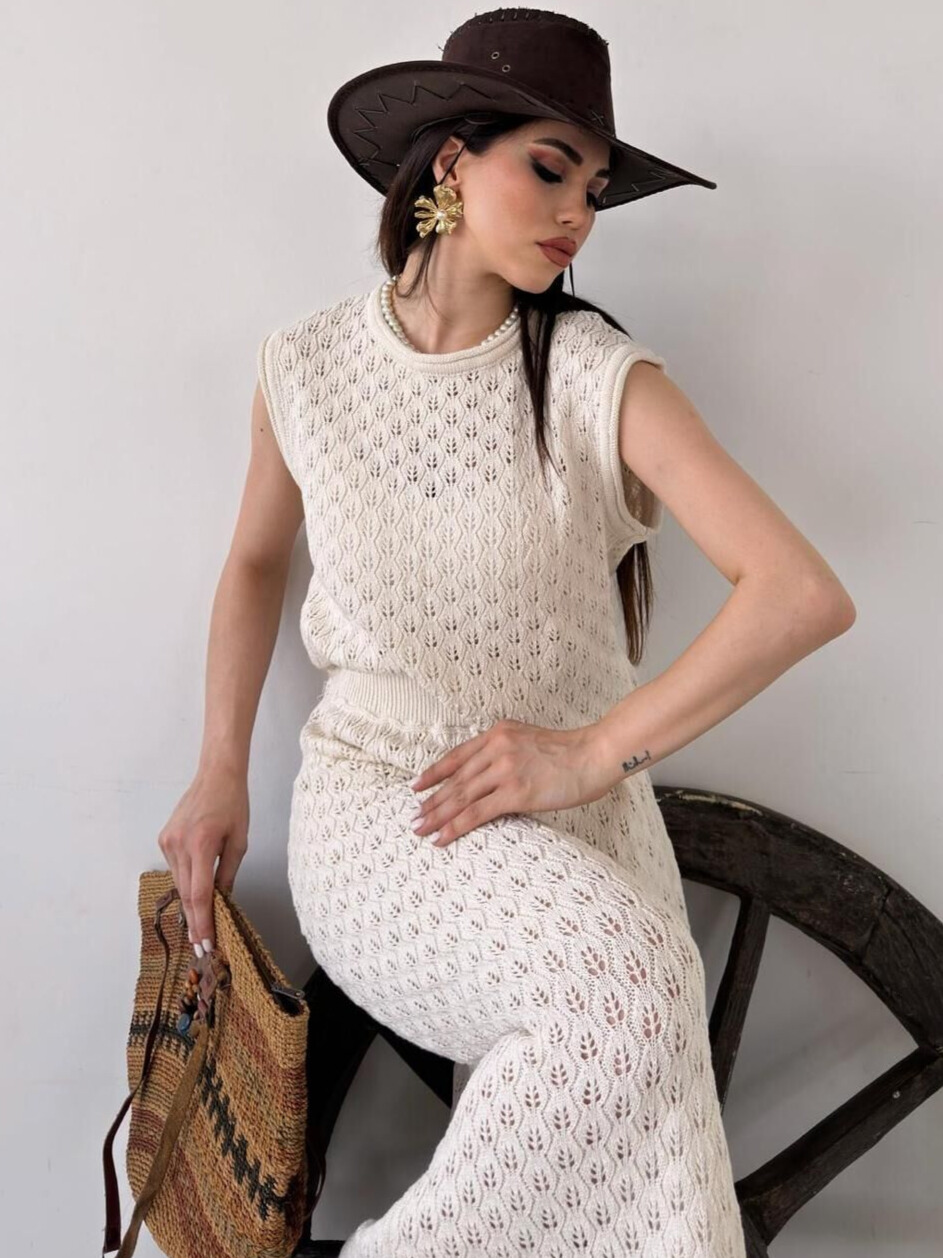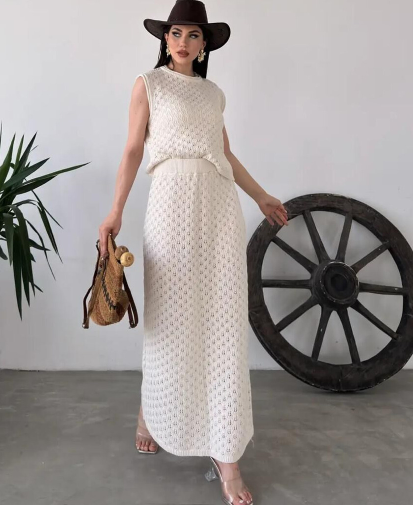 Alt Üst Takım - Bluz & Etek Triko - Krem ile yazın sıcak günlerinde serin kalmanın yanı sıra şıklığınızı da koruyabilirsiniz. Bu takım, beyaz veya pastel tonlarındaki sandaletlerle mükemmel bir uyum sağlar. Günlük şıklığınız için bir çanta ile tamamladığınızda, hem rahat hem de şık bir görünüm elde etmiş olursunuz. Özel davetler için ise topuklu ayakkabılar ve şık bir aksesuar ile stilinizi taçlandırabilirsiniz.
