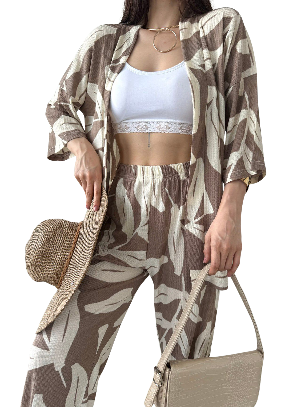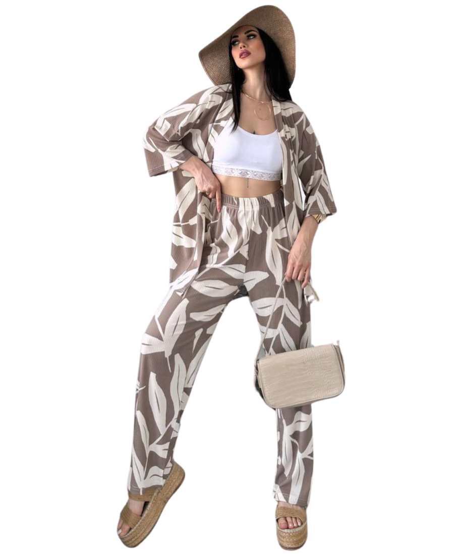 Şıklığın ve rahatlığın mükemmel bir birleşimi olarak tasarlanmış olan Alt Üst Takım Kimono, tarzınıza zarif bir dokunuş katmak için ideal bir parçadır. Desenli kahverengi tasarımı, her türlü kombin ile uyum sağlayarak gardırobunuzun vazgeçilmezlerinden biri olmayı vaat ediyor.