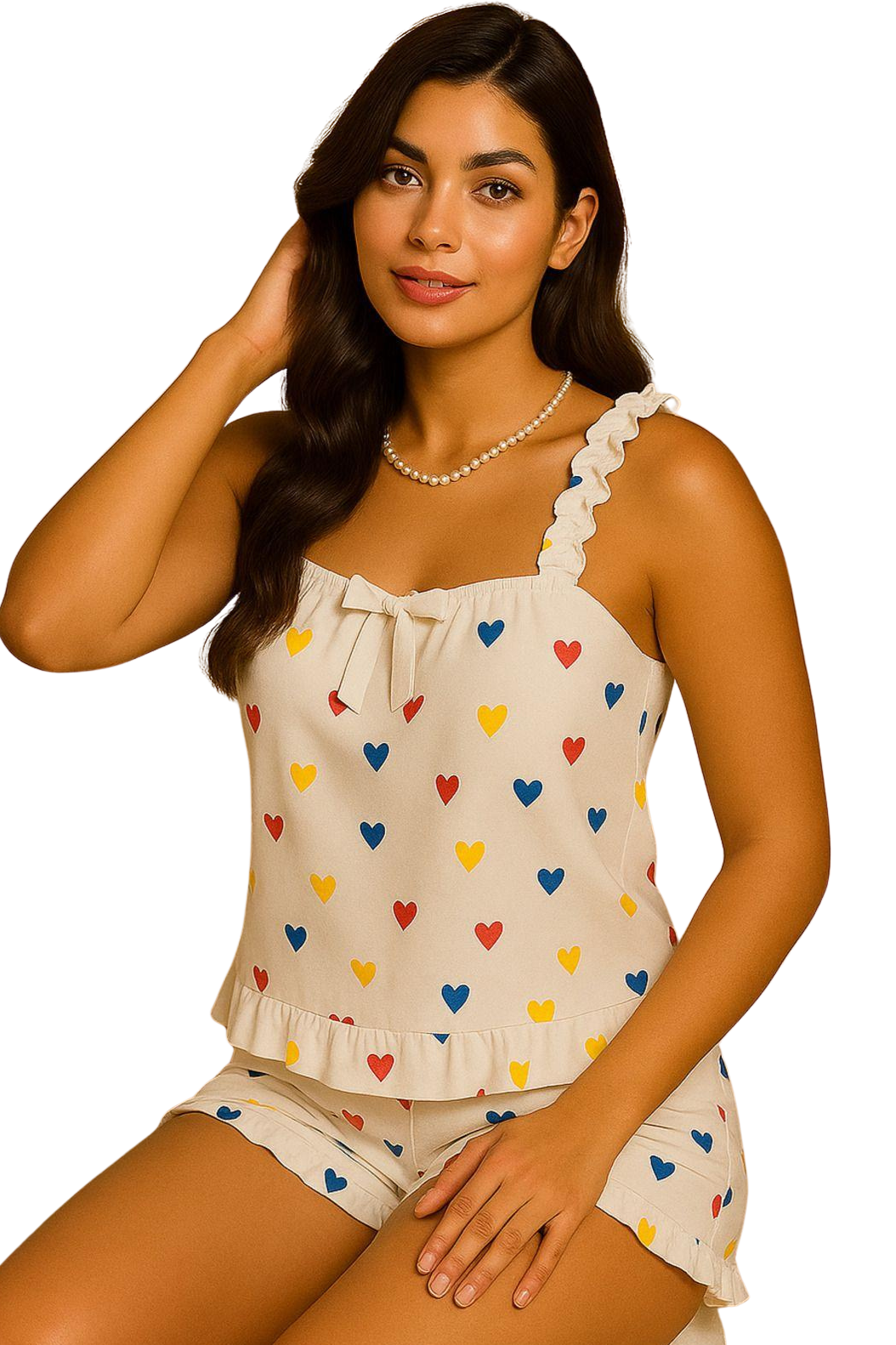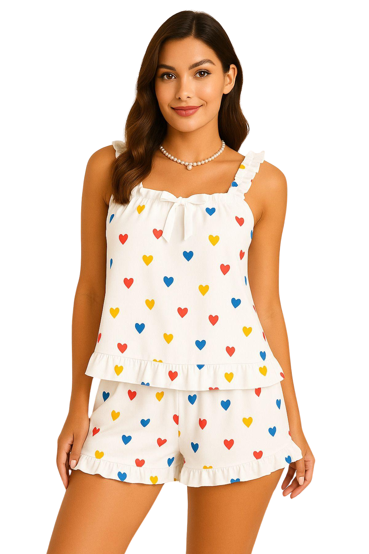 Kalp Baskılı Yumuşak Dokulu İp Askılı Şortlu Örme Pijama Takımı