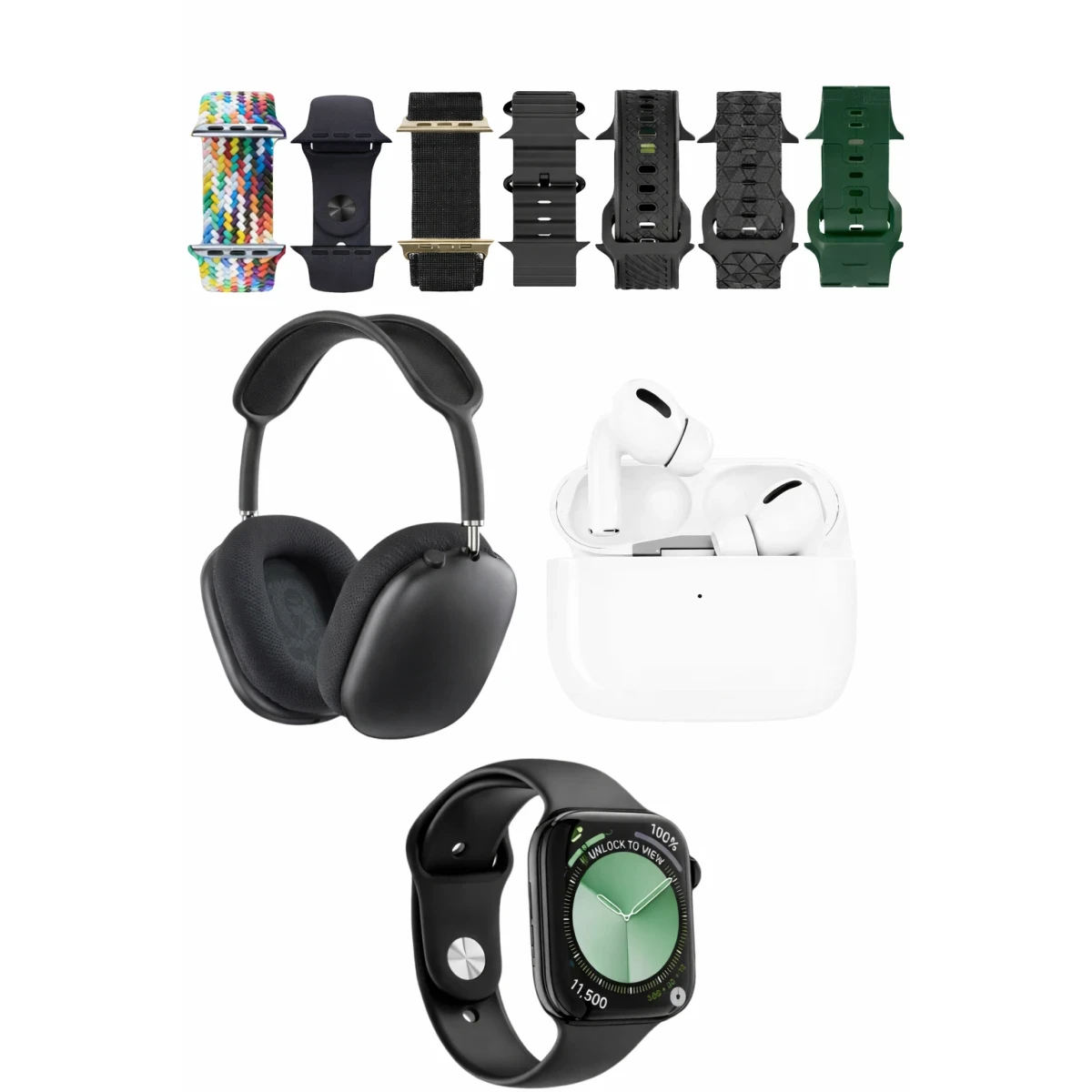 Karler Bass K32 Kombo 7 Adet Kordon Akıllı Saat Airpods Kulaklık Kafa Üstü Kablosuz Kulaklık Set - Siyah